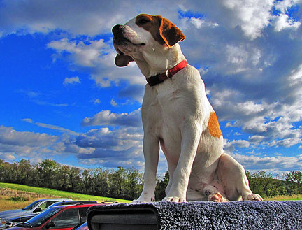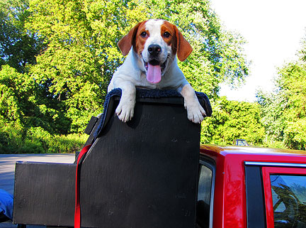 This is day five with Mo. Wow, this dog could not be more cooperative! A fast learner, he had never played with a human before and it was so funny to watch him develop a "tug of war" game with his toy. I was concerned this dog might be too docile for me. Forget that concern. I awakened the animal in him. Now when walking he is going crazy wanting to hunt, when playing I must tech him to calm down and be more careful. I have never experienced a dog so comfortable in his body. He is like a young kid exploring himself loving to stretch, use, physically feel, be felt. I opened the truck door for him to jump in. He hesitated and went to take a pee first. Already he knew not to go into the truck and pee again! I had to run into a store... what to do, what to do... with the temperature in the nineties I could not roll up the windows. I figured I would leave the leash on him and tie it to the outside window in case he jumped out, that way he would land on the ground with some room to move around. As I opened the door the leash wrapped itself around the stick shift by accident. I left it there and he ended up having just enough room to put his paws on the door ledge to look out for me and it also gave him full range inside the truck. How perfect was that? He waited for me no problem, no wining or barking, it was fantastic. I thought, "see how things can work out."! What a journey... music and otherwise!!!