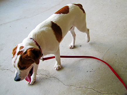Later, Mo is laying on the recliner with me. He jumped off, went to the door and gave a small, tiny whine before walking into the back room. With a spirit of not taking any chances I took him outside immediately. Good timing, good call. He definitely has diarrhea. My neighbor shouted over that her dog got loose and asked for me to keep an eye out. While doing my work I saw the dog outside my window. I went out and tried to use liver treats to coax it close so I could grab on to the end of the broken leash. When I saw it was not working I went and got Mo to entice some play between them. I wanted to distract the dog while I grabbed the leash end. The sight of Mo scared the dog away. I was left with a handful of Mo's liver treats laying all over the ground in the area where I have been trying to train him to shit for a week. What an idiot! Needless to say my thinking is a bit discombobulated today.