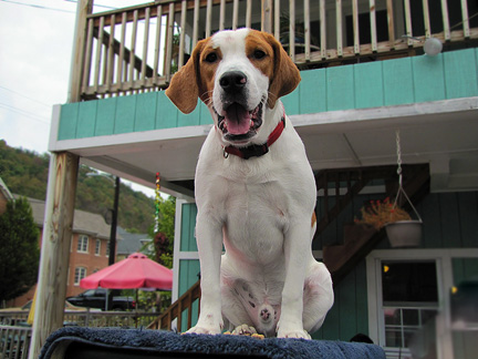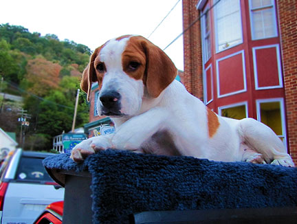 Carefully I step, slowly, thoughtfully I move... Today I spent time with a dog named "Mo" we took the Traveling Piano down by a river access area in Cherry Run, West Virginia. After going for a walk and his hearing music for the first time a guy named Crazy River John came over and talked with us. "Mo"... is a five month old Beagle, English Bulldog mix wanting an owner who can give him more attention than he is presently getting. NOT that we are going to partner... I am just exploring, experimenting... getting a feel. So I have been dealing with an emptiness that existed before Piano Dog Boner came into my life. Part of me says, "learn to live with just yourself." Another part of me says, "why, I don't have to if I don't want to." Lots of people go through life with partners, marriages, pets, etc... Ha. If I ever took stewardship of another dog it would be a courageous move for my life. It was bred into me that having another partner would diminish my love and the relationship I had with Boner. I know this is not true but never the less... While we hung out, my commitment issues were rearing their heads big time. They were manifesting with thoughts such as...as "Mo" sat next to me in the truck, "damm, he's taking the space where I just throw all my stuff while traveling, he is shedding MORE than Bo, where is his tail he has no damm tail... his nuts, look at those two little black things... disgusting!" Realty... this dog is a major cutie.. a complete lover, attentive, gentle, expressive, I think he may be very smart, wants to please, doesn't bark like crazy, is happy, happy, happy and loves people!