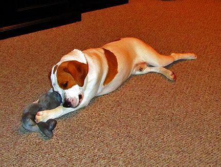 I would never have imagined a dog could cuddle and spoon and Mo can. He gives me full body hugs with his upper tow legs wrapping around me like arms. I am not exaggerating. He instigates the hugs like he knows what he is doing and wants. He now jumps into the bed to sleep with me. I'm not sure I want this because I am a toss and turner and need lots of room. He would like to sleep out on the sofa but I don't trust him yet. Last night before I closed the bedroom door he tried to escape to the couch three times. The last time I grabbed his hind legs and dragged him back into the room while he lay dead weight with his paws splayed out. It was a video moment for sure, very funny. He jumped on my lap this afternoon while I was resting in the chair and we fell asleep together. He was cradled in my arms on his back like a baby. He was neutered over a week ago and he allowed me to take out his stitches without moving at all. I had to pull the stringed stitches up to snip them. How trusting can an animal be? He is completely secure with my handling his entire body in anyway that I want, loves it, no part is off limits.