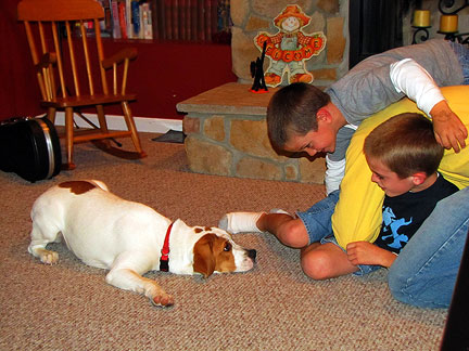 Occupies himself with play... a chew toy, squeeze ball and another small stuffed chew toy toy. He is getting to the stage where he will chew everything and anything, the furniture, clothes, dig the rug apart... what is it about dogs and shoes? I constantly redirect him not with a reprimand but without any thought, maybe a slight feeling of relief... like, "your relieved to find something like your toy." If I act like, "your fun and cute you little bad boy" that translates into continued play and encourages the activity. If I act demanding that creates resistance. I act like, as a matter of fact, "come, lets go, lets play, were going", etc... He has been playing with up to three young kids at a time, flailing and jumping all around him, running taunting, screaming acting spastic. Mo has been curious about it all but also is loving it!