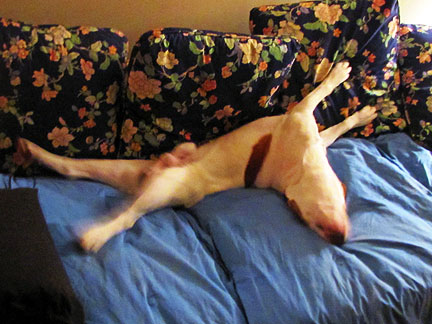 This dog named "Mo", having him with me... the process has been consuming my life. The thoughts surrounding his being in my life are draining me emotionally. He found the sofa; he's no dummy, took to it immediately. He waited till I took him outside today and did both number "1" and number "2". Good Boy! We went for our first walk. It was short but I was so exhausted I just laid in bed for most of the afternoon afterwards while telling myself, "your allowed to do this." The dog and I are a perfect match no question about it. I am not so sure about the timing for my life. I really want to do some things I have not been able to do with a dog in my life. Like right now, I need to go get my drivers license photo but can't leave the dog in the truck because he's not trained. I'd like to go and see three movies in a row. That can't happen without a lot of working around the needs and responsibilities. At the same time there is something to be said for having accountability and commitment, to have intimacy with another living being in my life.