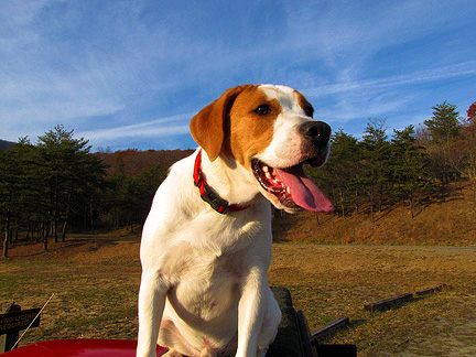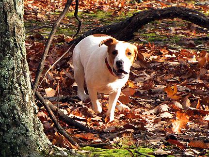 Another difference between dogs. Boner's favorite thing to do was mark. As we walked or he ran in the woods he would measure out his droppings to make as many as possible dropping tootsie roll size segments of poop everywhere. Mo has hound dog in him. (god help me) His favorite thing to do is to hunt out and explore different scents. We were walking up the road last night in the park about dusk. Mo was off leash. I saw deer crossing the road up ahead. I called Mo back before he saw them and decided what to do. They had gone so I proceeded forward with Mo off leash. I thought, "this is all trial and error and I must allow for the education if I want a dog that can be off leash. This was a first, where I knew he would probably get a strong scent. Well, it was just as people told me. There was no thought, not hesitation, no control the moment he connected with the scent his instincts took over completely and off deep into the woods he ran with the scent. My first instinct, don't panic. Then I began to call him so he would not get lost, then I began thinking options and "damm, this is happening as it is getting dark." I originally started to walk into the woods after him but then thought, "He will only go into the woods deeper if I follow him. I have no option but to return to the road because that is where he knows he last left me. As I began to walk back I saw him milling around near me but still... he was on the prowl and ready to run anywhere his nose lead him. Once I got ahold of him I did not punish but I did put him on the leash and walked him directly next to my side which he did not resist. This told me he knew what was going on. I took hold of his head, looked him straight in the eyes and said, "you cannot run away like that, it is bad, do not do it again." I had to be clear and direct and made sure he knew I was not happy. Onward... I must allow for mistakes and what might be interrupted as danger. Trust and faith I keep close. There is more at work in this relationship than my control and training. The dog is not stupid. He knows the basic direction from which he ran away. He certainly knows my scent. He does not want to leave me, he wants to stay connected and is responsible to his pack (me). He has been conditioned to be with me all the time so once he realizes I am not there he will instinctively want to reconnect. He wants to return to find out if I have the scent so he can get on it with me. I must allow for all that. If he learns he is going to get punished for returning... well that is a no brainer. I used to brag that I never had to train Bo but that was because as a pup I pretty much beat him into submission. There were no other tools in my repertoire but fear. (thats a story I've written about on another page) With Mo I now have the tools to respect responsibly in a way that has no violence. I am more realistic and capable in achieving the same results of total relational harmony that I had with Boner. With Mo there is no way around the fact that I must train. I really don't like the idea of behavioral conditioning and training for relationships but must accept that it is an aspect of life that feels necessary now. Maybe its a cop out... it is what it is and better than using fear.